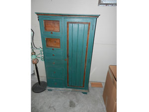 Wooden bench, Green wooden two door hutch, serpentine front wooden table