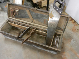 Plumbers Level, Center Finder, Carpenters box with tools,